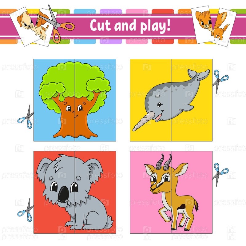 Разрезай и играй. Флэш-карты. Цветной пазл. Образовательный развивающий рабочий лист. Страница с заданиями. Игра для детей. Мультяшный стиль. Забавный персонаж. Векторная иллюстрация