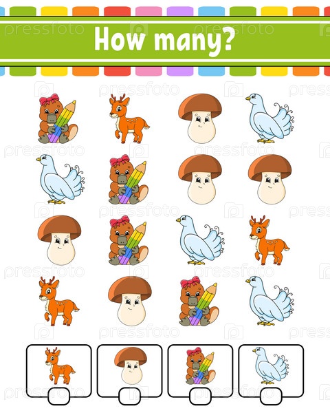 Игра-счет для детей. Счастливые персонажи. Изучение математики. Сколько предметов на картинке. Рабочий лист по образованию. С местом для ответов. Векторная иллюстрация