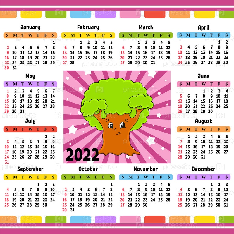 Календарь на 2022 год с милым персонажем. Веселый и яркий дизайн. Изолированная цветная векторная иллюстрация. Мультяшный стиль