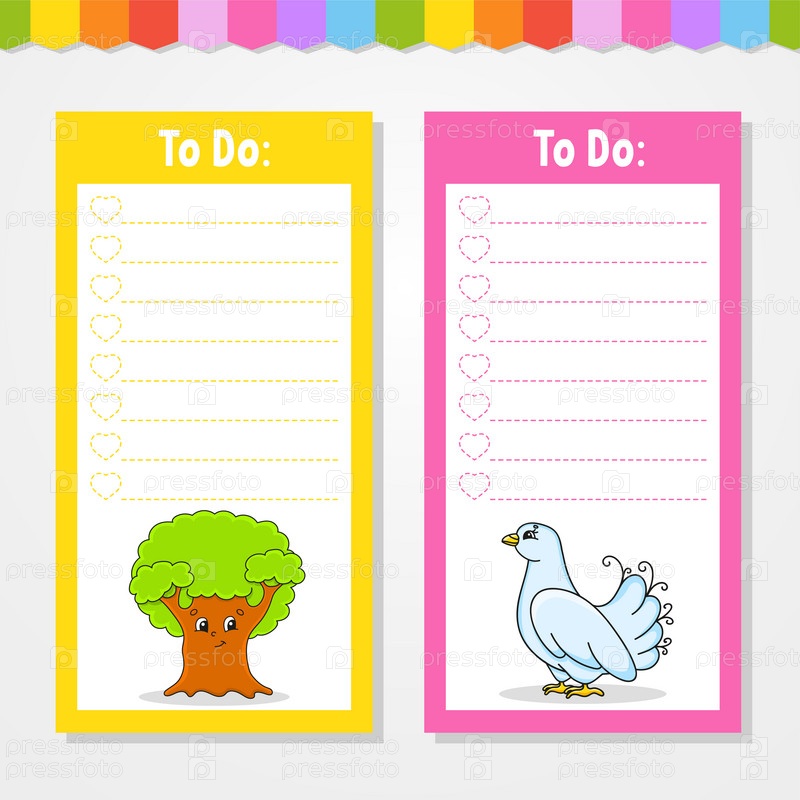 Список дел для детей. Пустой шаблон. Прямоугольная форма. Изолированная цветная векторная иллюстрация. Забавный персонаж. Мультяшный стиль. Для дневника, блокнота, закладки