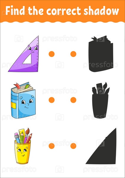 Найдите правильную тень. Образовательный развивающий рабочий лист. Игра на соответствие для детей. Страница с цветной активностью. Головоломка для детей. Милый персонаж. Векторная иллюстрация