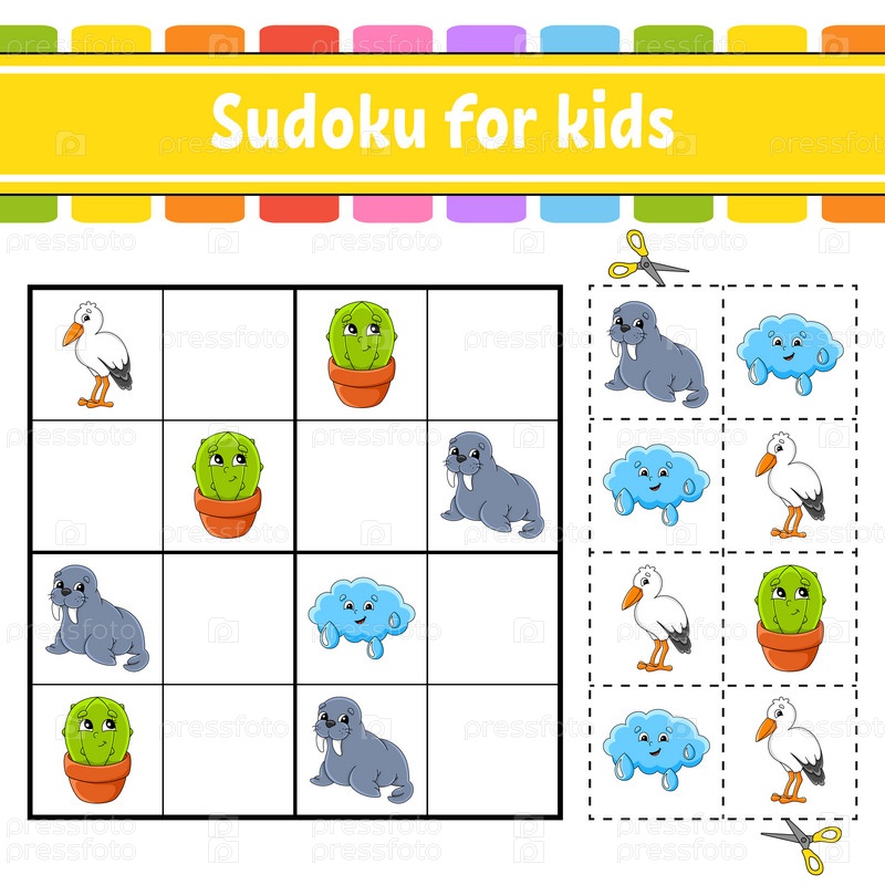 Судоку для детей. Образовательно-развивающий рабочий лист. Страница с заданиями и картинками. Игра-головоломка для детей. Тренировка логического мышления. Забавный персонаж. Векторная иллюстрация