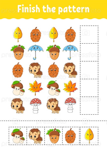 Закончите узор. Вырежьте и играйте. Образовательный развивающий рабочий лист. Осенняя тема. Страница с заданиями. Персонаж мультфильма. Векторная иллюстрация
