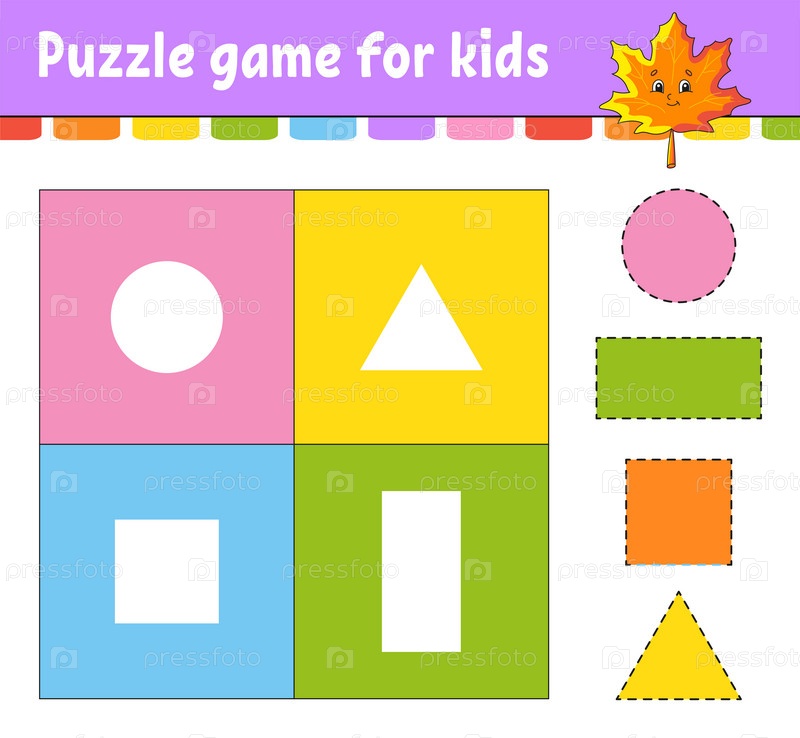Игра-головоломка для детей. Вырезать и вставить. Практика вырезания. Изучение фигур. Рабочий лист по образованию. Круг, квадрат, прямоугольник, треугольник. Страница с заданиями. Персонаж мультфильма