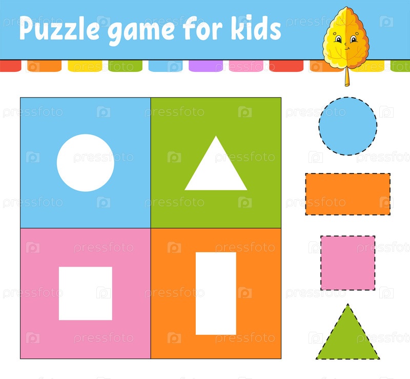 Игра-головоломка для детей. Вырезать и вставить. Практика вырезания. Изучение фигур. Рабочий лист по образованию. Круг, квадрат, прямоугольник, треугольник. Страница с заданиями. Персонаж мультфильма
