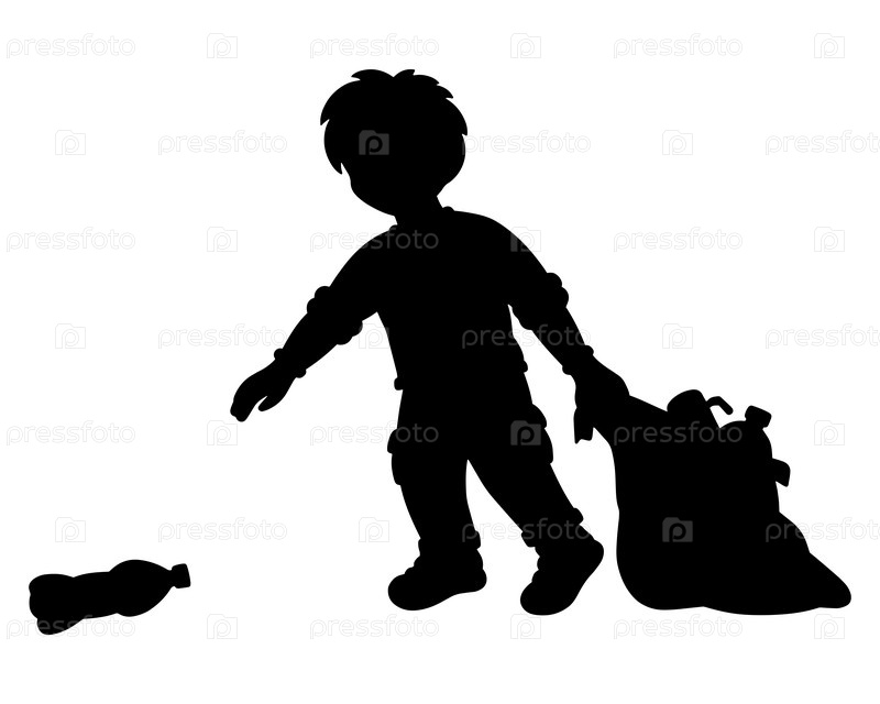 Черный силуэт. Мальчик кладет мусор в мусорный мешок. Элемент дизайна. Векторная иллюстрация на белом фоне. Шаблон для книг, наклеек, плакатов, открыток, одежды