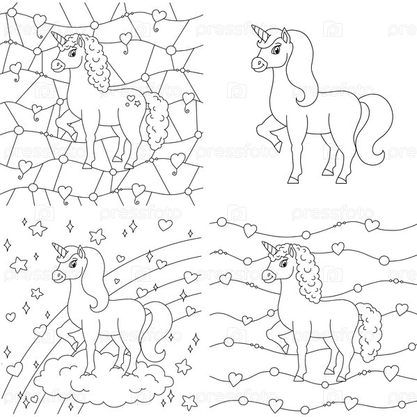 Волшебный фея единорог. Милая лошадь. Страница раскраски для детей. Необычный узор. Мультяшный стиль. Векторная иллюстрация на белом фоне