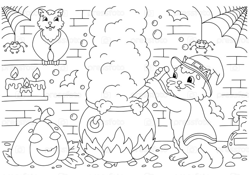Кот варит зелье в подземелье в большом котле. Раскраска для детей. Персонаж в мультяшном стиле. Векторная иллюстрация на белом фоне