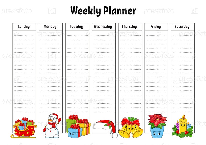 Планировщик на неделю. Яркий красочный пустой шаблон для печати. Рождественская тема. Векторная иллюстрация