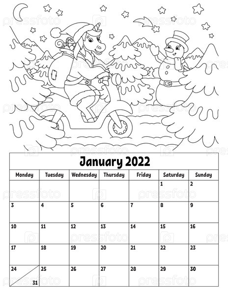 Вертикальный календарь на 2022 год с милым персонажем. Раскраска для детей. Неделя начинается в понедельник. Изолированная векторная иллюстрация. Мультяшный стиль