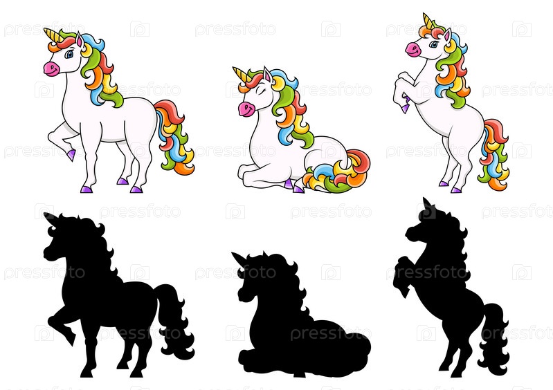 Милый единорог. Волшебная сказочная лошадь. Черный силуэт. Персонаж мультфильма. Красочная векторная иллюстрация. Изолированный на белом фоне. Элемент дизайна
