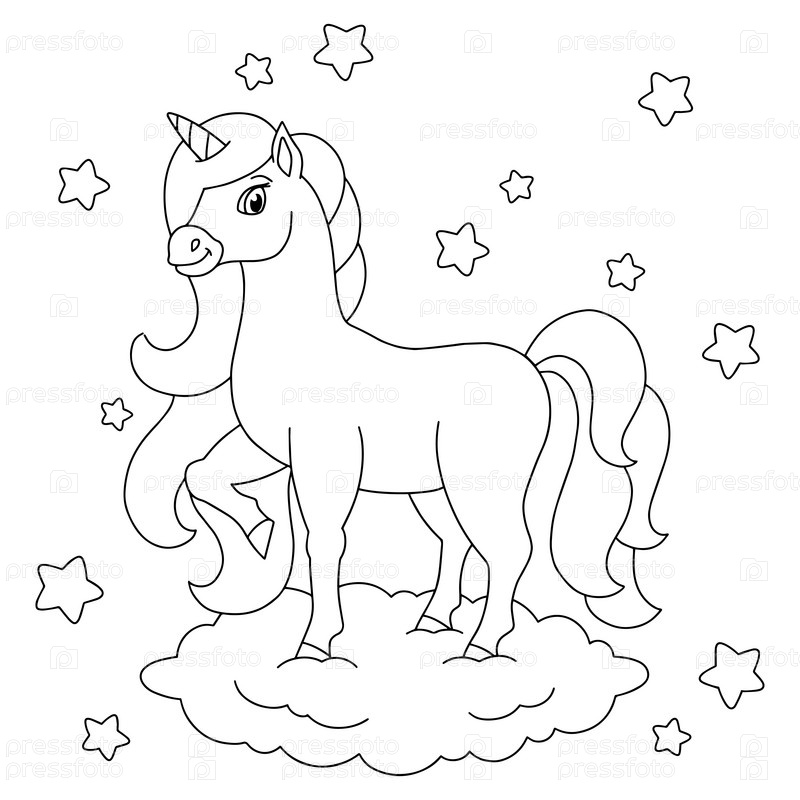 Красивый единорог стоит на облаке. Раскраска для детей. Персонаж в мультяшном стиле. Векторная иллюстрация на белом фоне