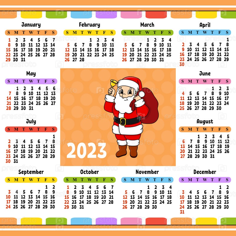 Календарь на 2023 год с милым персонажем. Веселый и яркий дизайн. Мультяшный стиль. Векторная иллюстрация