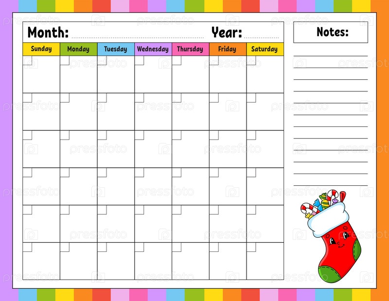 Пустой шаблон календаря на один месяц без дат. Красочный дизайн с милым персонажем. Векторная иллюстрация
