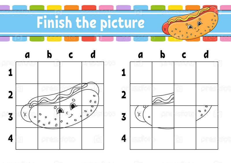 Дорисуй картинку. Страницы раскраски для детей. Развивающий рабочий лист. Игра для детей. Практика письма. Персонаж мультфильма. Векторная иллюстрация. Тема барбекю