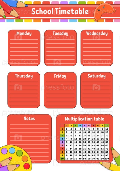 Расписание школы с таблицей умножения. Для обучения детей. Изолировано на белом фоне. С милым персонажем мультфильма