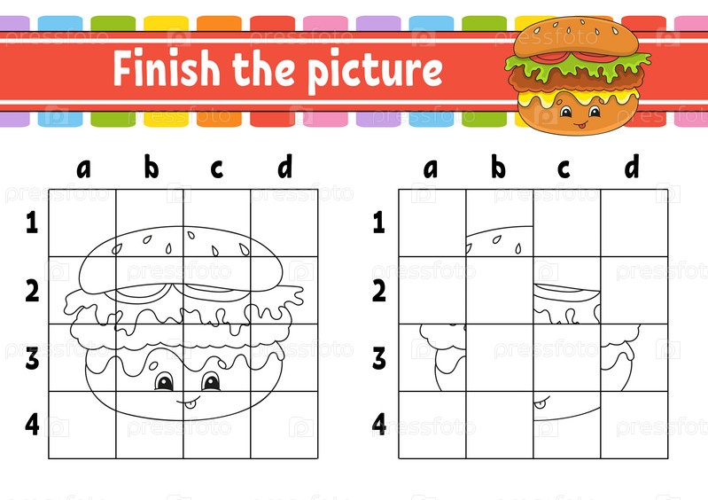 Дорисуй картинку. Страницы раскраски для детей. Развивающий рабочий лист. Игра для детей. Практика письма. Персонаж мультфильма. Векторная иллюстрация. Тема барбекю