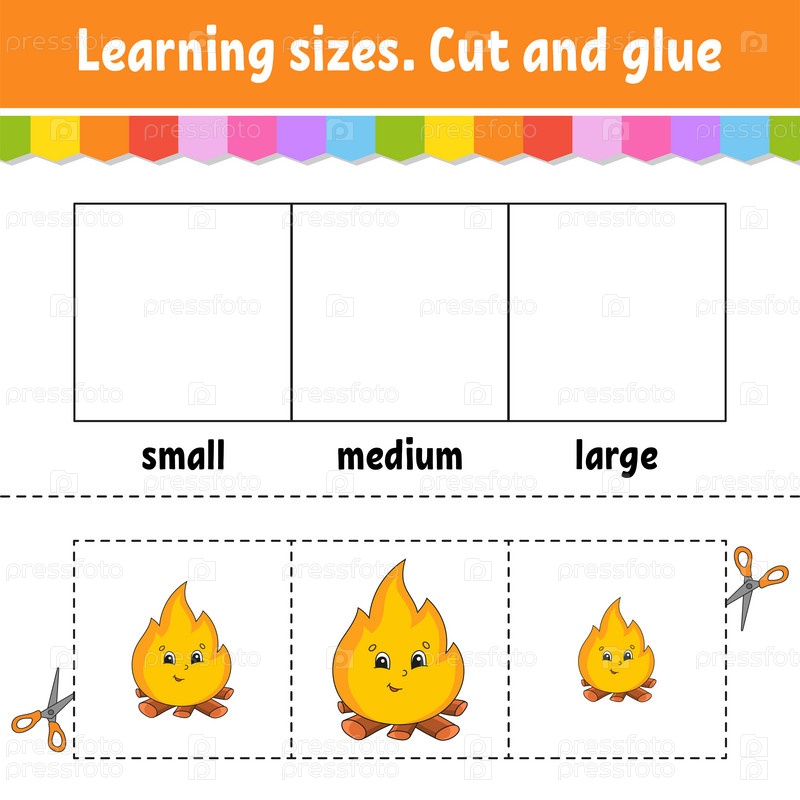 Изучаем размеры. Вырезаем и склеиваем. Легкий уровень. Рабочий лист с цветной активностью. Игра для детей. Персонаж мультфильма. Векторная иллюстрация