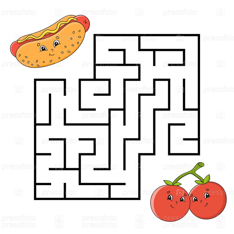 Квадратный лабиринт. Игра для детей. Головоломка для детей. Загадка лабиринта. Цветная векторная иллюстрация. Изолированная векторная иллюстрация. Персонаж мультфильма. Тема барбекю