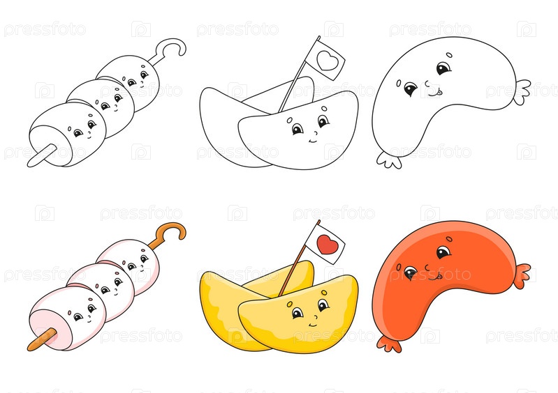 Набор раскрасок для детей. Милые персонажи мультфильмов. Черная обводка. С образцом. Векторная иллюстрация. Тема барбекю