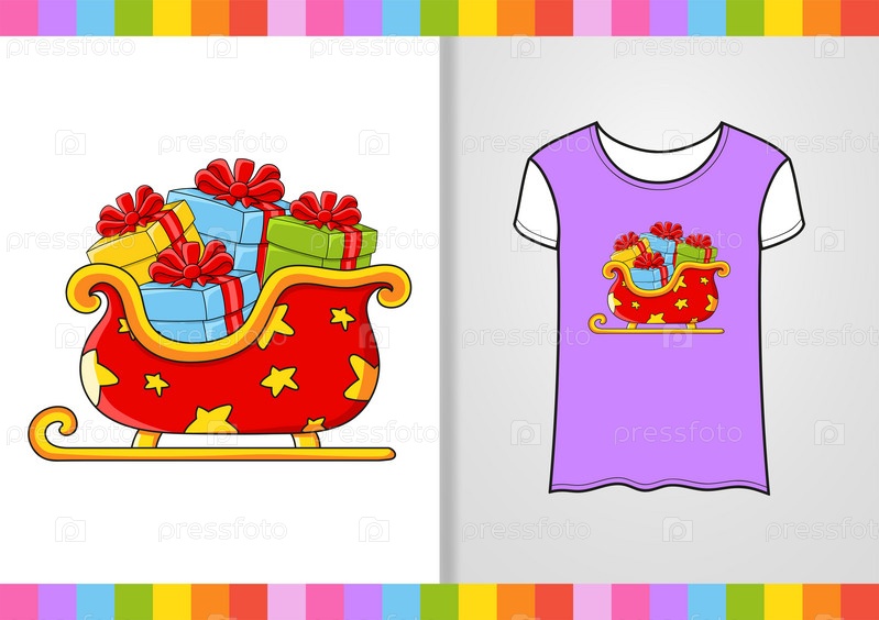 Дизайн футболки. Милый персонаж на футболке. Рождественская тема. Нарисовано от руки. Красочная векторная иллюстрация. Мультяшный стиль. Изолировано на белом фоне