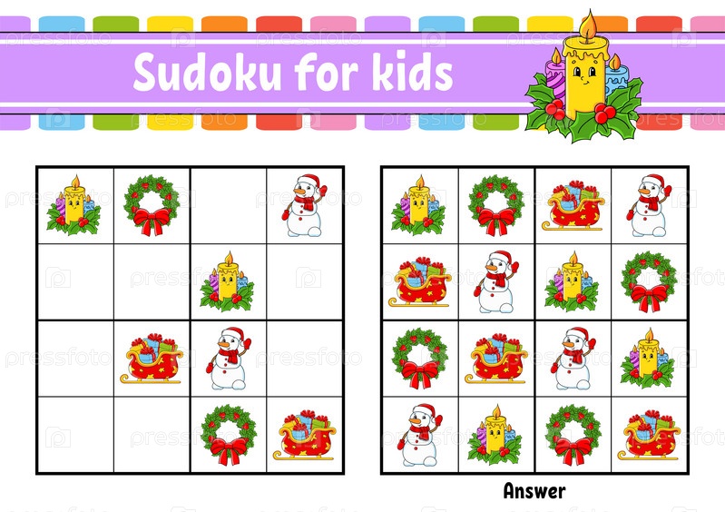 Судоку для детей. Образовательный развивающий рабочий лист. Персонаж мультфильма. Цветная страница с заданиями. Игра-головоломка для детей. Рождественская тема. Изолированная векторная иллюстрация