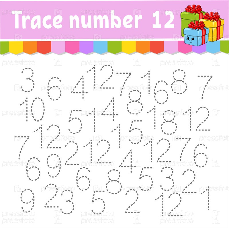 Номер трассировки. Практика письма. Изучение цифр для детей. Рабочий лист по развитию образования. Страница с заданиями. Рождественская тема. Изолированная векторная иллюстрация в милом мультяшном стиле