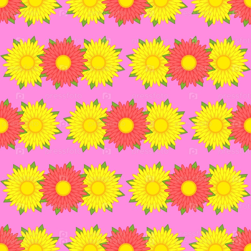 Бесшовные узоры из астр желтого и красного цвета с зелеными листьями на розовом фоне