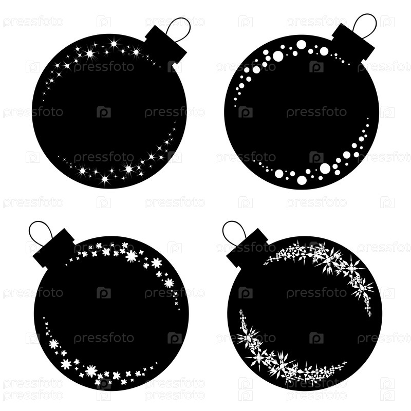 Набор плоских изолированных черно-белых силуэтов елочных игрушек и шаров на белом фоне