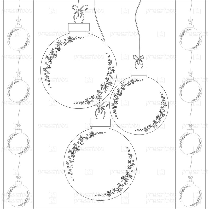 Белые елочные шары шарики на веревках. Черная обводка для раскрашивания