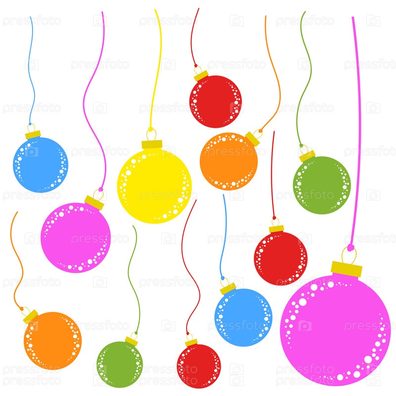 Набор плоских цветных изолированных елочных игрушек шары на веревках. Простой стиль