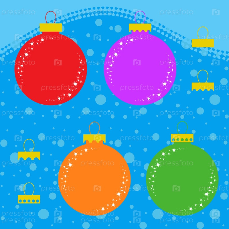 Набор плоских цветных изолированных елочных игрушек в виде шаров с разными креплениями. Простой дизайн для украшения. На синем фоне