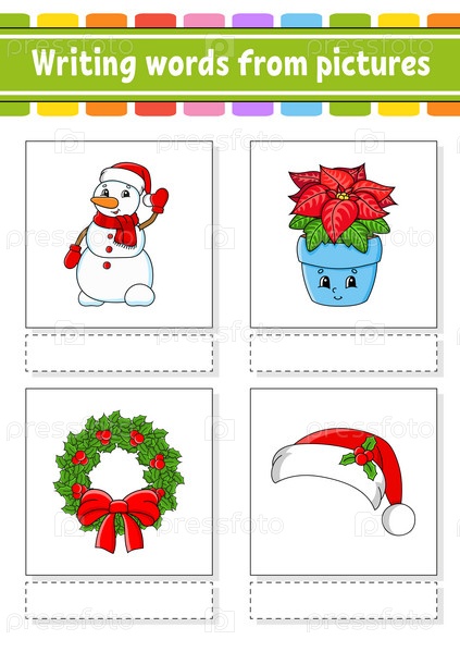 Написание слов с картинок. Учите английские слова. Образовательный развивающий рабочий лист. Цветная страница с заданиями. Персонаж мультфильма. Векторная иллюстрация