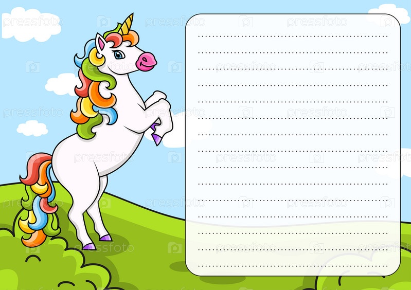 Шаблон цветного листа для заметок с единорогом. Бумажная страница для журнала, блокнота, дневника, писем, расписания, органайзера. Милый персонаж мультфильма. Линованный лист. Векторная иллюстрация