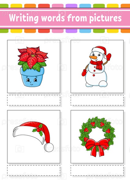 Написание слов с картинок. Учите английские слова. Образовательный развивающий рабочий лист. Цветная страница с заданиями. Персонаж мультфильма. Векторная иллюстрация