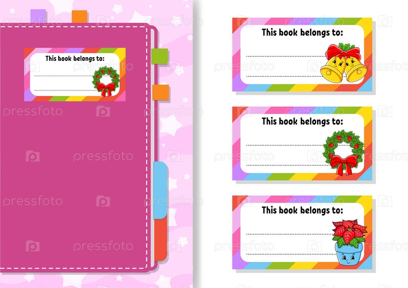 Наклейки на этикетки книг для детей. Прямоугольная форма. Персонаж мультфильма. Для дневника, блокнота, книги. Изолированные на белом фоне. Векторная иллюстрация