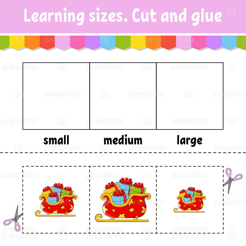 Изучаем размеры. Вырезаем и склеиваем. Легкий уровень. Рабочий лист с цветной активностью. Игра для детей. Персонаж мультфильма. Векторная иллюстрация