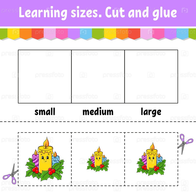 Изучаем размеры. Вырезаем и склеиваем. Легкий уровень. Рабочий лист с цветной активностью. Игра для детей. Персонаж мультфильма. Векторная иллюстрация