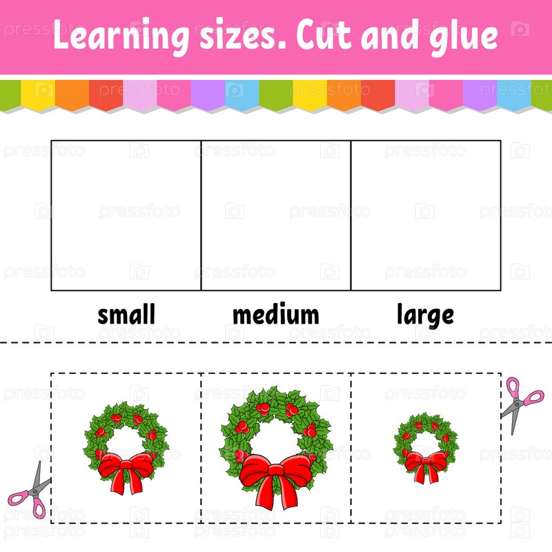 Изучаем размеры. Вырезаем и склеиваем. Легкий уровень. Рабочий лист с цветной активностью. Игра для детей. Персонаж мультфильма. Векторная иллюстрация