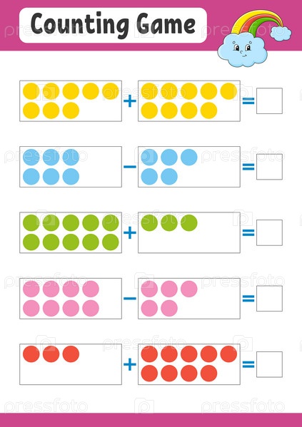 Сложение и вычитание. Задание для детей. Образовательный развивающий рабочий лист. Цветная страница активности. Игра для детей. Забавный персонаж. Мультяшный стиль. Векторная иллюстрация