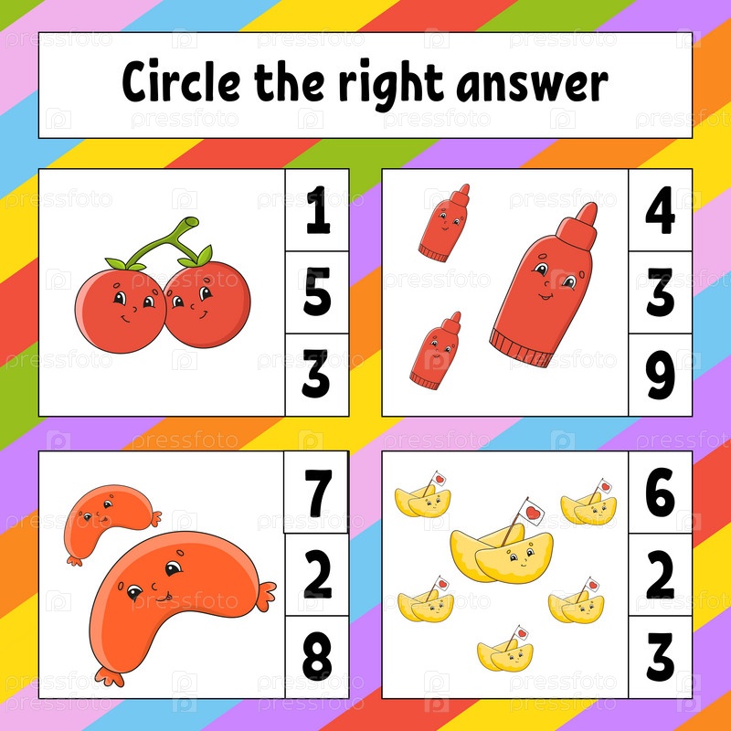 Обведите правильный ответ. Рабочий лист по развитию образования. Страница с заданиями с картинками. Игра для детей. Забавный персонаж. Мультяшный стиль. Векторная иллюстрация