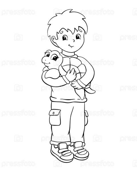 Маленький мальчик держит черепаху. Раскраска для детей. Цифровая марка. Персонаж в мультяшном стиле. Векторная иллюстрация на белом фоне