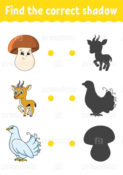 Найдите правильную тень. Образовательный развивающий рабочий лист. Игра на соответствие для детей. Страница с цветной активностью. Головоломка для детей. Милый персонаж. Векторная иллюстрация. Мультяшный стиль
