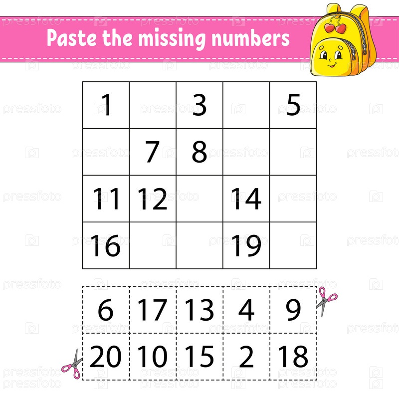 Вставьте пропущенные цифры от 1 до 20. Игра для детей. Практика письма. Изучение цифр для детей. Образовательный развивающий рабочий лист. Страница с заданиями. Изолированная векторная иллюстрация в милом мультяшном стиле