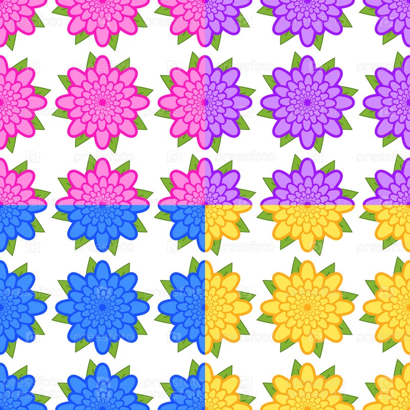 Набор бесшовных узоров из розовых, фиолетовых, синих, желтых цветов с зелеными листьями на белом фоне