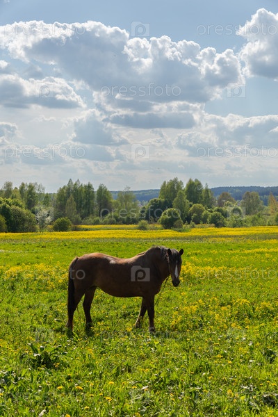 Коричневый конь в поле на фоне голубого неба с облаками. Портрет коня в поле с цветами