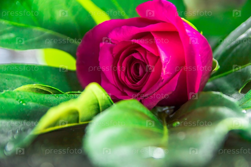Один розовый бутон розы лежит на большом зеленом листе