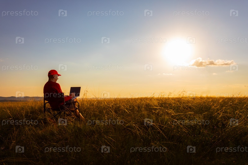 Мужчина работает на ноутбуке, сидя в кресле на открытом воздухе на природе. концепция удаленной работы