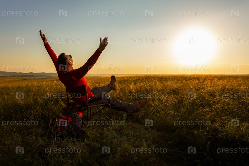 Счастливый человек наслаждается летними каникулами, свободой, сидя в маленьком кресле на природе и глядя на закат