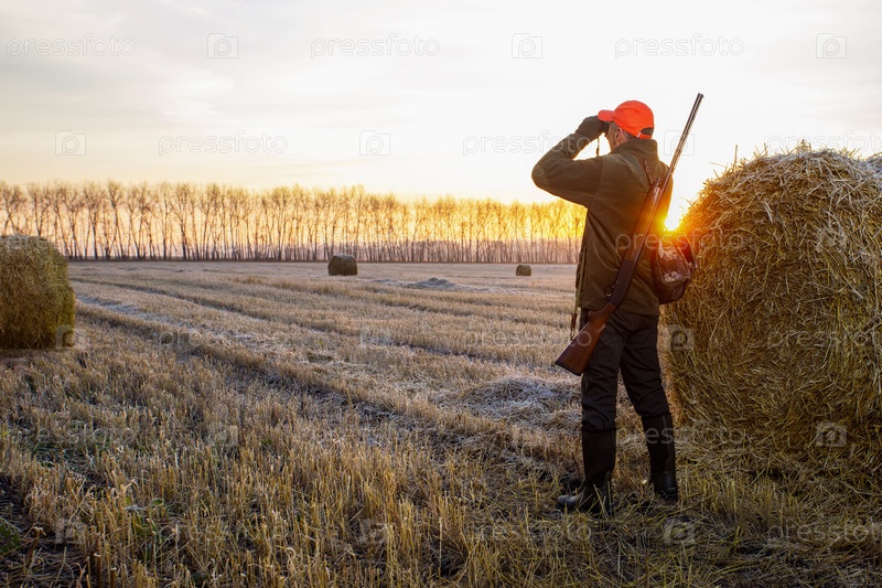 Охотник с ружьем смотрит в бинокль в поле